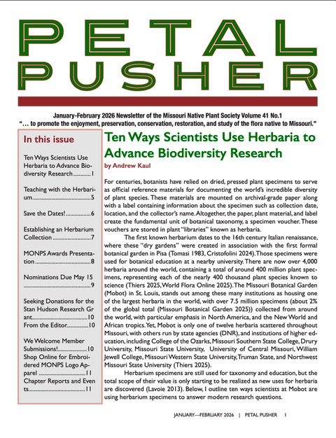 At the conclusion of the project, grant recipients will be expected to prepare research results for publication in a peer-reviewed scientific journal, Missouriensis (the peer-reviewed journal of the Missouri Native Plant Society), or the society’s newsletter The Petal Pusher. Alternatively, recipients can present their research at the Missouri Botanical Symposium as either a poster or oral presentation. The symposium is held each fall in Rolla, Missouri.